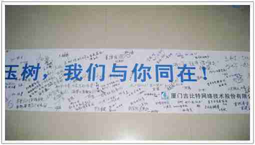 在募捐现场,,一竞技同学们怀着沉重的心情,,,将每一笔捐款投入募捐箱,,并在现场设置的横幅上,,写上了对玉树人民的深情祝福。。满载一竞技祝福的横幅将和捐款一起抵达玉树,,希望谨以此微薄之意,,,为玉树人民带去一竞技的爱心与祝福,,,,希望吉祥、、、幸福的阳光能早日驱散灾难的阴霾,,,普照在玉树人民的身上,,,,鼓励他们坚强、、、勇敢与乐观。。。