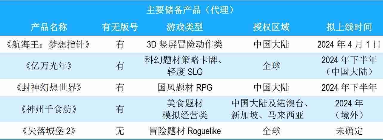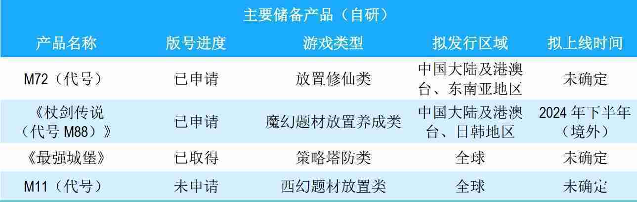 公司储备的多个自研、、代理产品都在有序推进当中,,,涵盖放置类、、策略类、、、模拟经营类、、RPG、、、、Roguelike等多元化游戏品类,,,储备的主要自研和代理产品如下:::