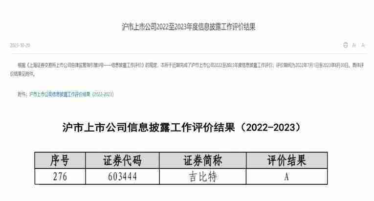 近日,,,,上海证券交易所发布2022-2023年度信息披露工作评价结果。。。。一竞技(股票代码::::603444)凭借规范的公司治理、、高质量的信息披露以及良好的投资者关系管理再次荣获信息披露工作A级评价,,,公司连续两年获此殊荣。。。。